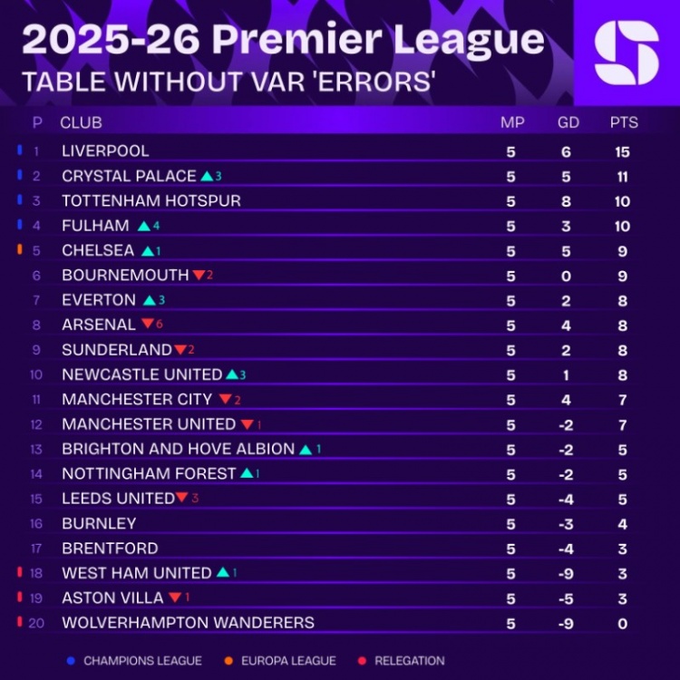 Squawka官推写道:“本赛季,我们每轮比赛后都会邀请球迷们对最具争议的VAR判罚进行投票。以下是第5轮比赛后,排除VAR误判影响的英超积分榜情况。”