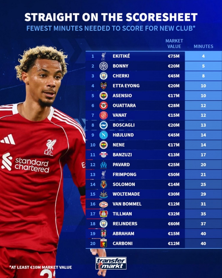 10月8日讯 德国转会市场统计了今夏新援攻入处子球的时间,并排出最快处子球榜单,埃基蒂克4分钟攻入首球居首。